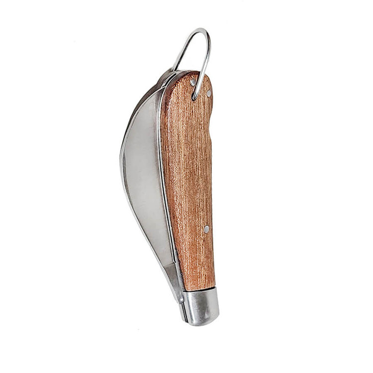 پیوند زدن عبارت است از اتصال دو قسمت گیاهی مختلف به یکدیگر، به صورتی که آن دو قسمت با هم یکی شده و به عنوان گیاهی جدید به رشد ادامه دهد. باغداران برای دستیابی به محصول بهتر، یک رقم با کیفیت را بر روی یک پایه مقاوم پیوند می زنند. چاقوی پیوندزنی از ابزارهای ضروری باغبانی است که برای پیوند زدن استفاده می شود. به کمک چاقوی پیوند، پایه و پیوندک را به راحتی می توان برش زد. این چاقو ها علاوه بر پیوند برای قلمه گیری از گیاهان مختلف هم مورد استفاده قرار می گیرند. کشاورزان و باغداران با تجربه از چاقوی پیوندزنی برای ایجاد خراش روی ساقه برخی گیاهان به سبب ریشه زنی نیز استفاده می کنند. این چاقو ساخت کشور چین بوده و دارای تیغه ای از جنس فولاد ضدزنگ می باشد. تیغه آن به صورت سرکج و دارای دسته ای چوبی با طراحی زیبا است. ابعاد، وزن و اندازه چاقو از مواردی است که باید به آن توجه کرد زیرا در راحتی هنگام کار و سرعت بخشیدن به آن تاثیرگذار است. چاقوی سنگین دست را خسته می کند و ممکن است باعث آسیب شود. وزن این چاقوی پیوندزنی کمتر از 100 گرم می باشد که کار با آن را راحت و لذتبخش کرده است.